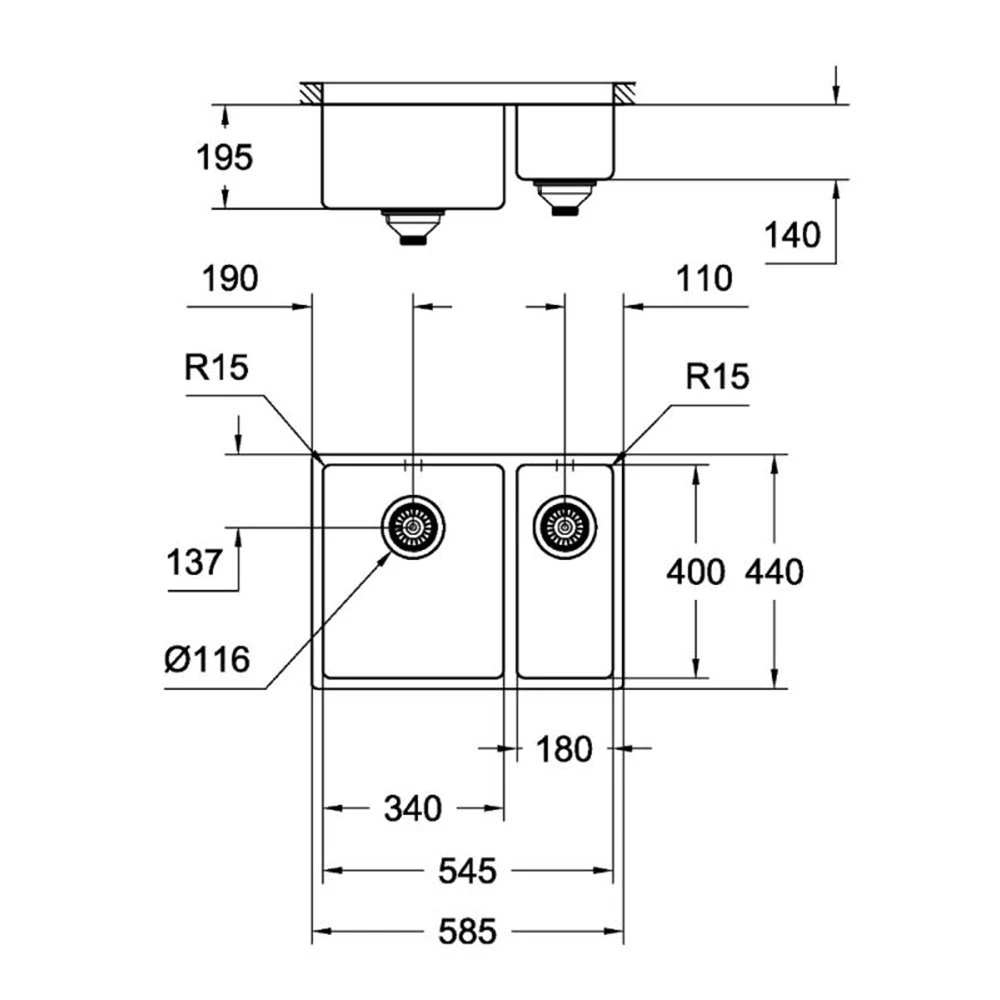 - Διάσταση γούρνας: 340x400x195mm & 180x400x140mm